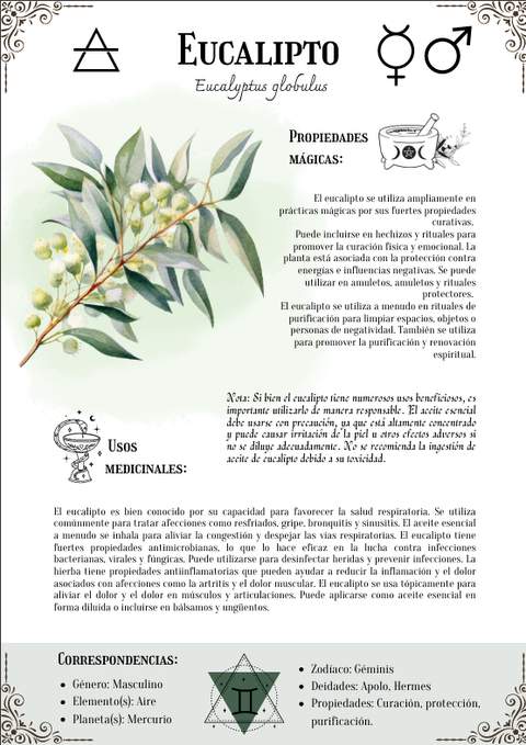 Propiedades Mágicas y Usos medicinales de mas de 20 hierbas. Como por ejemplo: aloe vera, sauco,ajo, Gingkobiloba, Jengibre, onagra, eucalipto, melisa, albahaca, melisa, lavanda, regaliz , cardo mariano, ortiga, pasiflora, menta, palma, hierba de San Juan, Cúrcuma, Valeriana, etc.